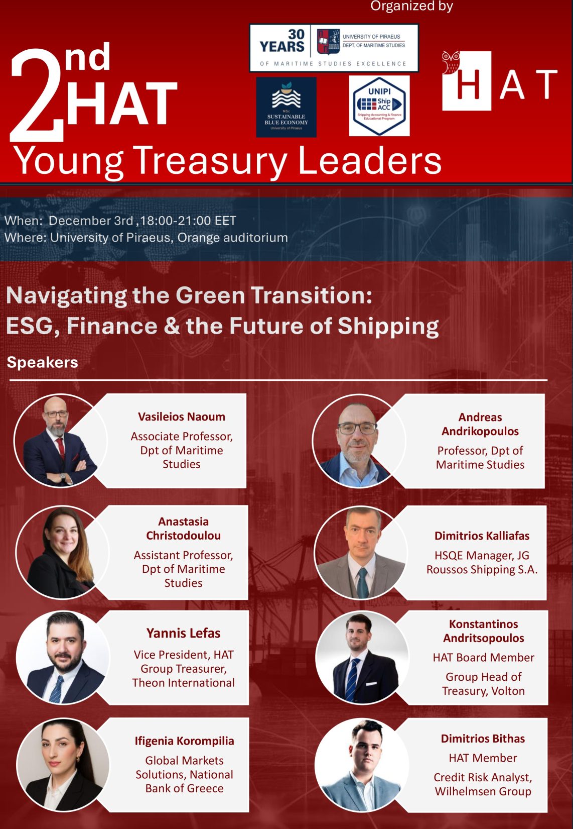 Tην Τετάρτη 03/12/2025, 6:00μμ-9:00μμ, το Τμήμα Ναυτιλιακών Σπουδών διοργανώνει ημερίδα με θέμα “Navigating the Green Transition: ESG, Finance & the Future of Shipping” την οποία θα συντονίσει ο Αναπληρωτής Καθηγητής Ναούμ Βασίλειος-Χρήστος.